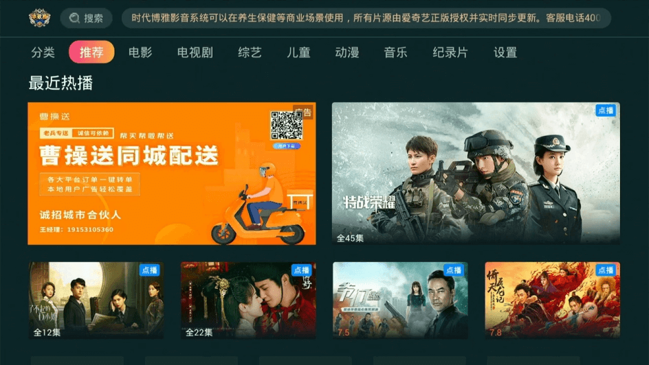 电影点播,支持本地点播,在线点播,合法片源;点播自动在线更新,分辨率支持高清及超清切换;支持第三方播放APP应用。